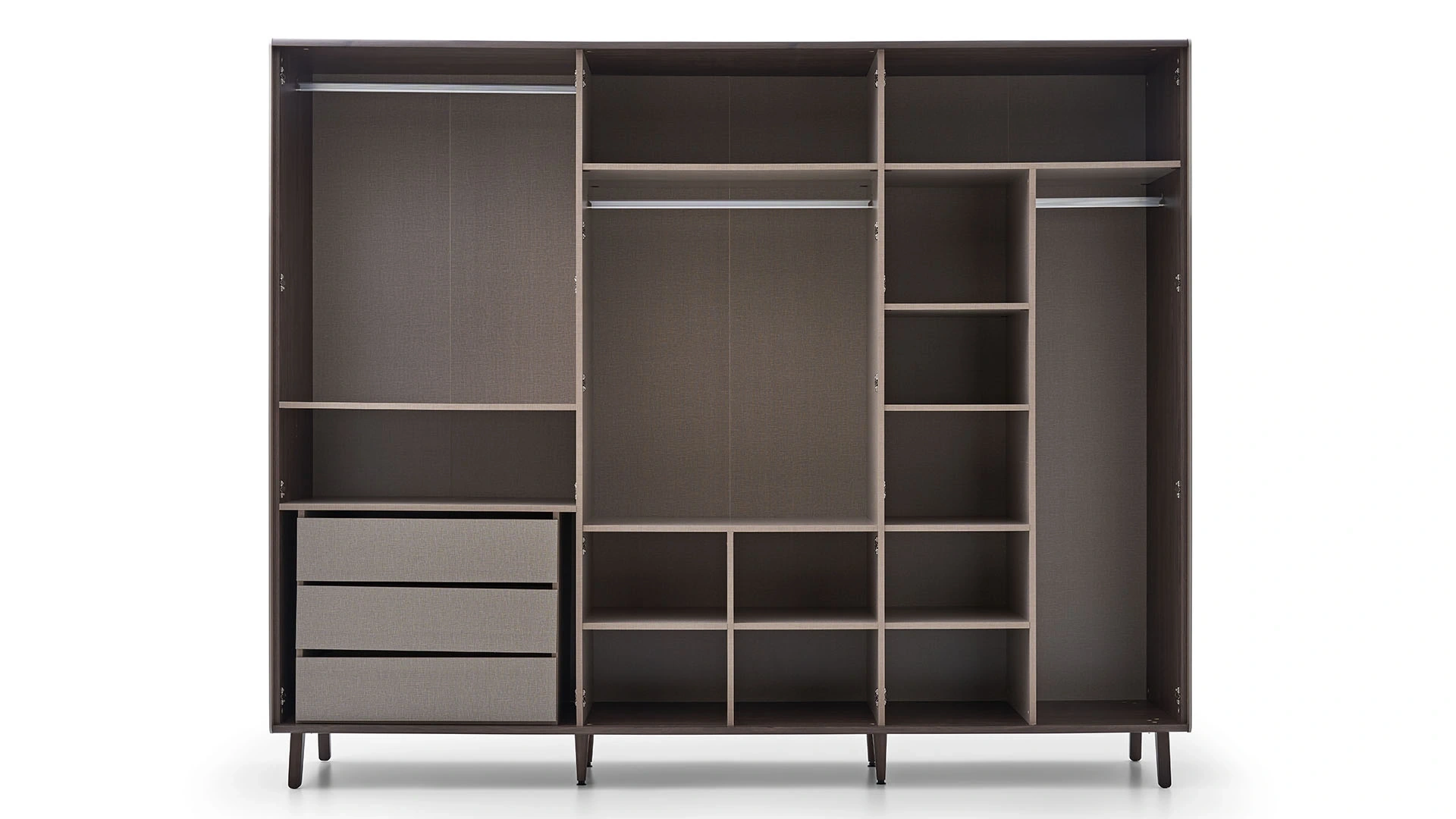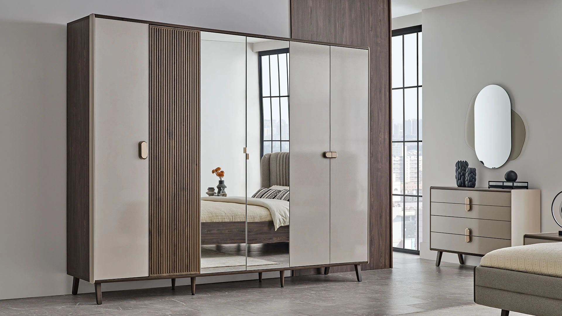 Bend 6 kapaklı dolap, şık ve zarif tarzı, geniş, kullanışlı iç tasarımı ile beğeni kazanıyor. Bronz kaplamalı kulpları, temizliği kolaylaştıran, hoş ahşap ayakları, kapak tasarımında yer alan profil detayları ile görünümünü özelleştiren dolabı dilerseniz yatak odanız dilerseniz de giyinme odanız için tercih edebilirsiniz.