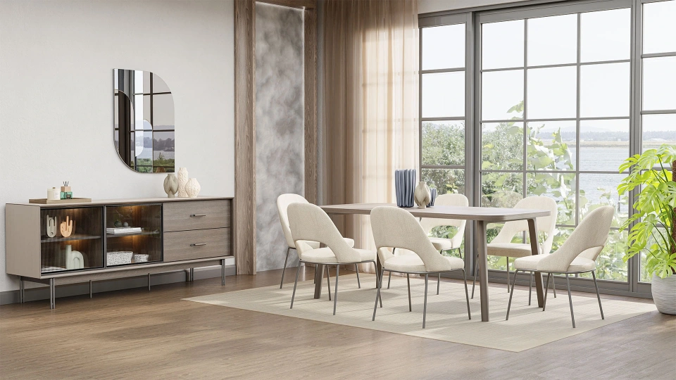 Calista Koleksiyonu, modern ve şık bir yaşam alanı yaratmak için tasarlanmıştır. Şık ve yalın bir estetik anlayışıyla, zamansız bir tasarım sunan bu koleksiyon, kaliteli malzemeler ve fonksiyonel detaylarla karakterize edilmiştir. Minimalist çizgilerle birleşen nitelikli dokular, her mekânda sakin bir atmosfer oluştururken, kullanıcıların ihtiyaçlarına yönelik pratik çözümler sunar.Koleksiyonda kullanılan açık raflı ve cam kapaklı tasarım, hem modern hem de trendlere uygun bir görünüm sağlar. Fonksiyonel yapısı sayesinde, farklı alanlarda rahatlıkla kullanılabilir. Cam kapaklar üzerindeki çizgili desen folyo uygulaması ve raf arkalarındaki LED aydınlatmanın yansımaları, hoş bir silüet oluştururken, mekânın estetiğine katkıda bulunur.Calista Koleksiyonu, doğal taş dokusuna sahip dekorlarla zenginleştirilmiş, sıcak tonlardaki ceviz dekoru ile yaşam alanlarına uyum sağlar. Zarif metal ayaklar ve modern detaylar, koleksiyonun güçlü duruşunu pekiştirirken, kullanıcıya konfor ve şıklığı bir arada sunar. Bu özelliklerin kombinasyonu, hem estetik hem de işlevsellik açısından tatmin edici bir koleksiyon tasarımı ortaya çıkarmaktadır.Calista Koleksiyonu, modern yaşamın gereksinimlerine cevap veren, şık ve yalın bir tasarım anlayışıyla, zamansız bir güzellik sunmaktadır. Kullanıcıların beklentilerini karşılamak üzere düşünülmüş detaylarıyla, her türlü iç mekânda dikkat çekici bir atmosfer yaratmayı hedeflemektedir.