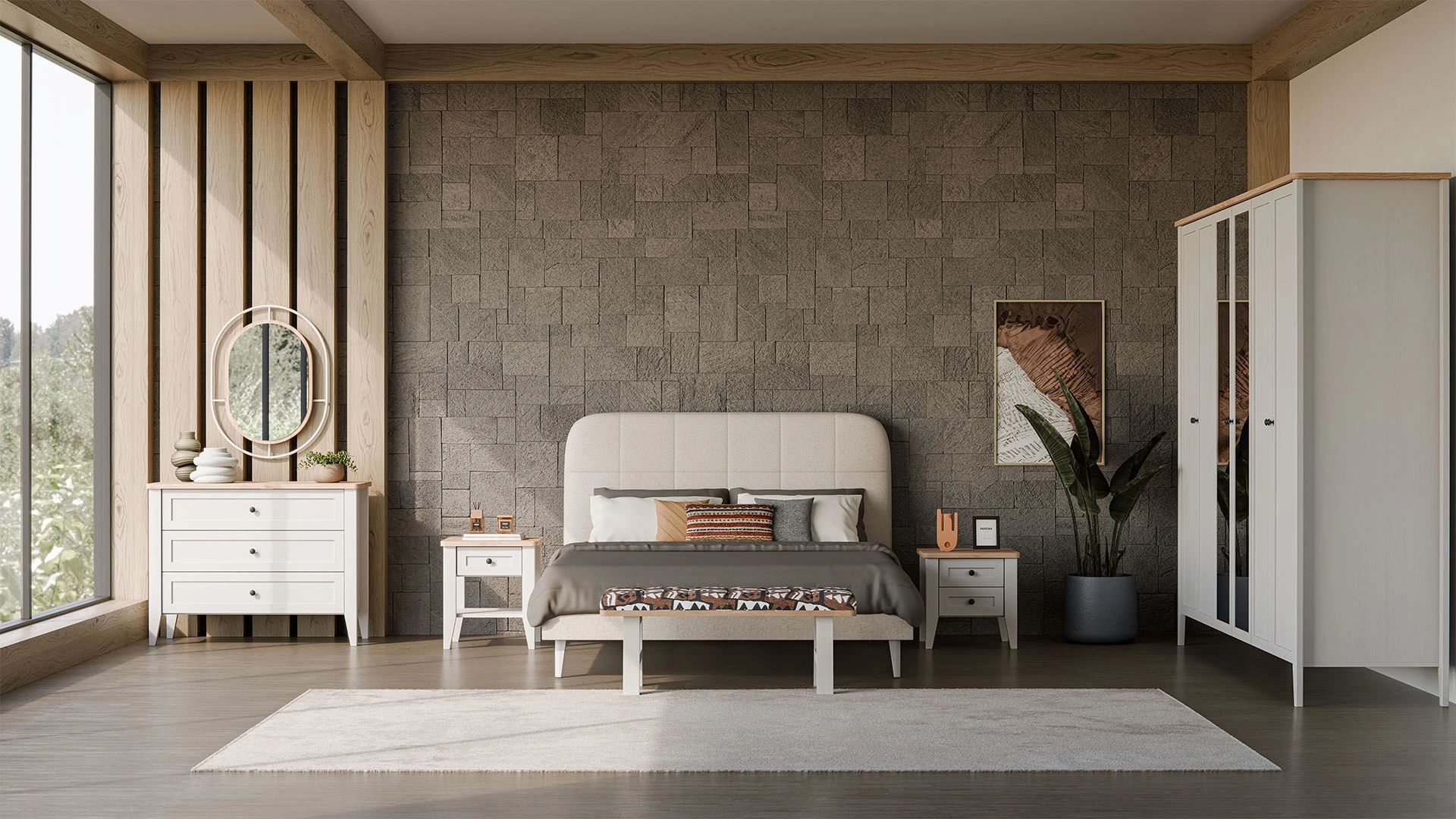 Calmera 6 Kapaklı Dolap, evinizde düzeni şıklıkla buluşturan özel parçalardan. Kum beji renginin yumuşak tonu yatak odanıza huzuru getiriyor. İki aynalı kapak ise ortamı daha geniş ve ferah gösteriyor. Yerden yüksek ayak tasarımı hem temizlik açısından kolaylık sağlıyor hem de dolaba zarif bir duruş kazandırıyor. Dolabın iç hacmi son derece geniş. Giysilerden nevresimlere kadar birçok eşyayı rahatlıkla sığdırabilirsiniz. Calmera 6 Kapaklı Dolap, sade ama özenli dekorasyonların ayrılmaz parçası.