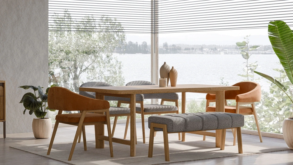 The Kalia Dining Room Set brings together modern and classic lines with its elegant details and warm color tones. With its natural oak wood texture, this set creates a more intimate atmosphere. The set includes foldable, round and rectangular table models, chair options, console, pouf, coffee table, and side tables. The harmonious modules complement each other and add a warm harmony to your living space.