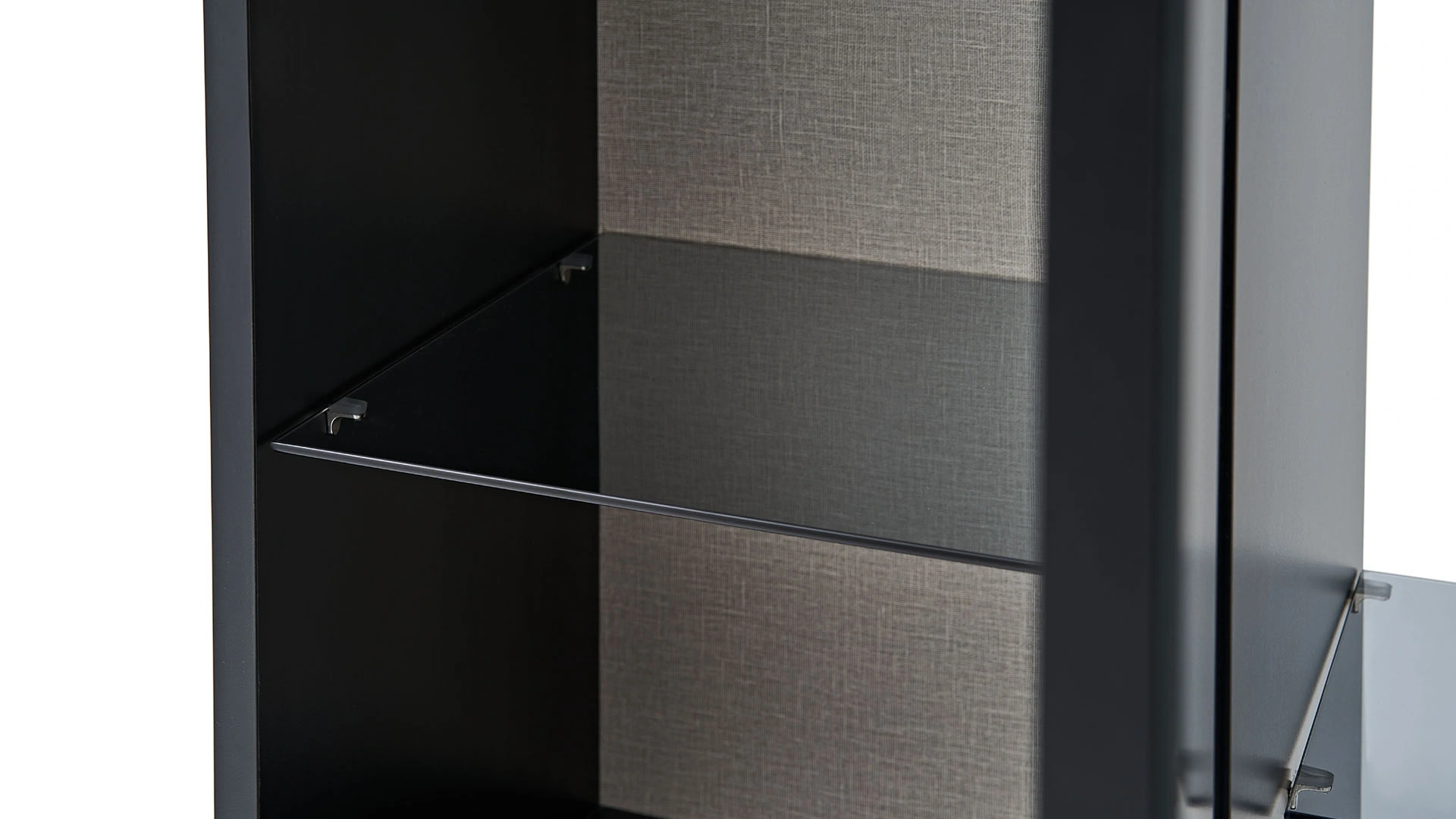 Solid TV ünitesinin üst yan modülü, siyah metalin ön planda olduğu görünümü ile modern bir dekorasyon oluşturmak isteyenlerin beğenisini kazanıyor. Kafesli, siyah bir dolap alanı bulunan üst modülde üç açık raftan oluşan bir sergileme alanı da yer alıyor. Solid TV ünitesini tamamlamak için siz de üst yan modülü satın alabilirsiniz.