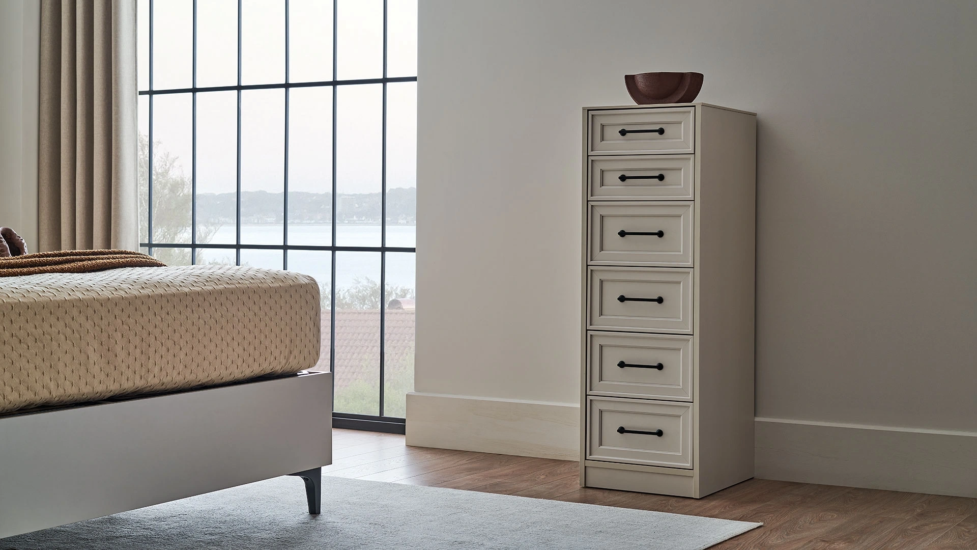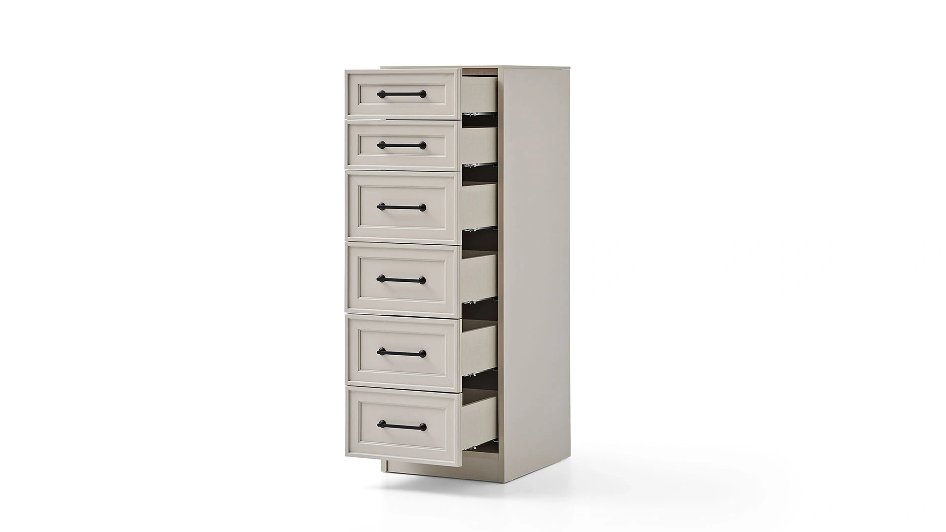 Trento yüksek şifonyer, dar yatak odaları için kullanışlı bir alternatif oluyor. 6 çekmeceli yüksek şifonyer kıyafetlerinizi ya da aksesuarlarınızı düzenli bir şekilde saklamanıza imkan tanıyor. Siz de yatak odanız için Trento yüksek şifonyeri tercih edebilirsiniz.