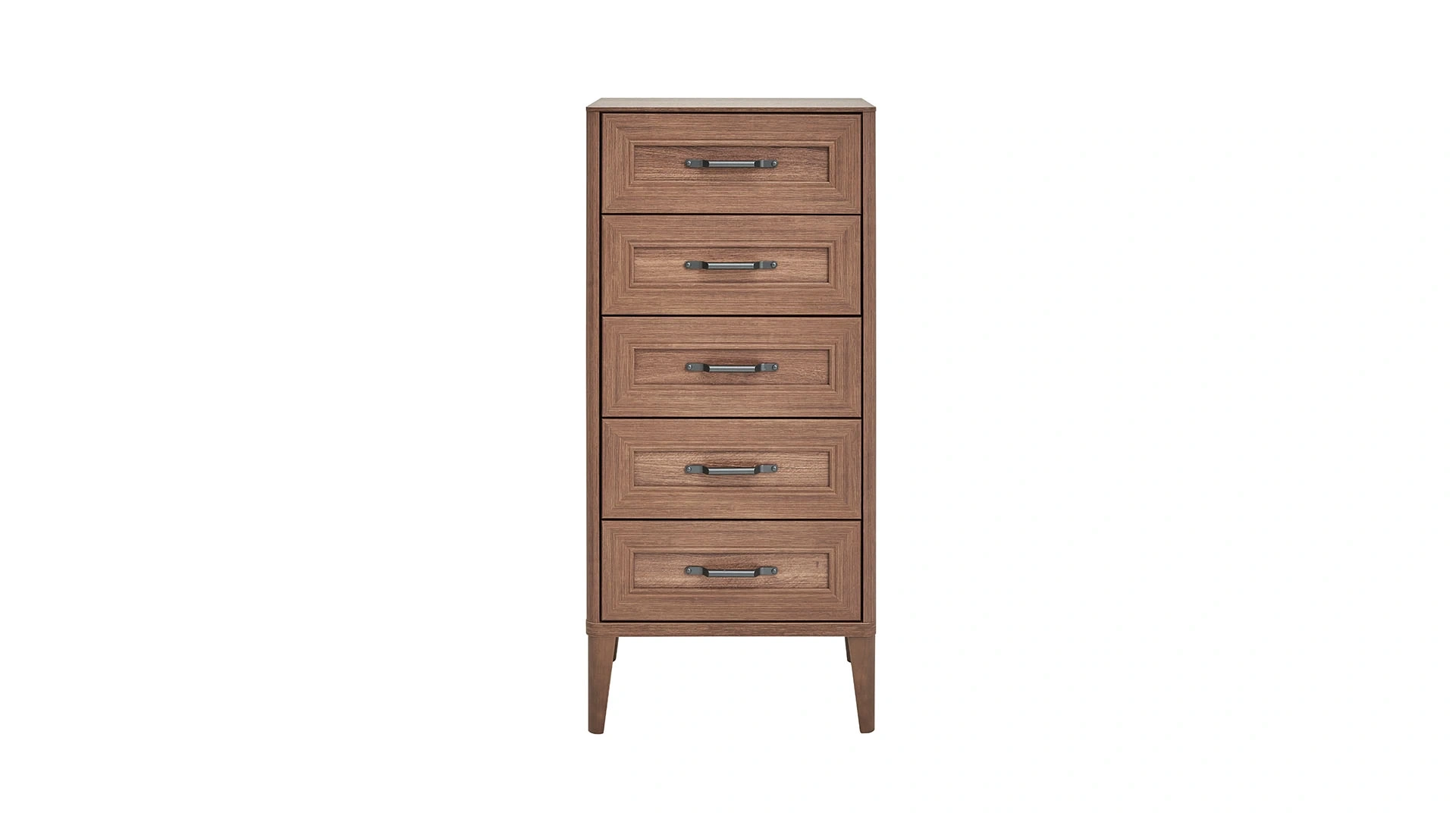 Vermont 5 Çekmeceli Yüksek Şifonyer, pijama, iç çamaşırı, kişisel bakım eşyaları, nevresim takımları, battaniyeler gibi evde yer bulamadığınız tüm eşyalarınızı depolamanızı sağlıyor. Bu şifonyer, 5 adet geniş çekmecesi sayesinde tüm dağınıklığı kaldırırken yüksek ayak yapısıyla ise alt kısmın temizliğini pratik hale getiriyor. Şifonyerin ceviz rengi ahşabı, doğal ve sıcak bir atmosfer oluşturuyor. Böylece her tarza uyumlu, modern yatak odası tasarımı sizleri bekliyor.